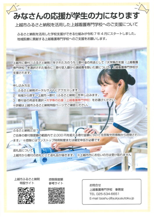 上越市ふるさと納税の寄付金の用途について「大学等の支援(上越看護専門学校)」を選択できるようになりました。